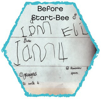 Five-year-old Alice started Down Hall Primary School able to write her name. Her letter shapes were clear but not all the letters were correctly formed. With Start-Bee’s handwriting lessons, Alice learned how to form the letters correctly and how to grip her pencil effectively. As a result, her handwriting has improved not only in appearance but in the amount she is writing too. So much so, that her parents revealed, at a recent parents’ evening, that Alice now writes constantly at home creating registers, lists and making cards. In class, her self-confidence has improved and Alice now helps others with their writing; she really enjoys the Start-Bee sessions. That was eight weeks into the scheme. See what a difference, a year learning to write with Start-Bee, has made to Alice